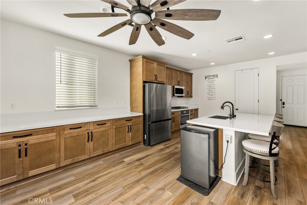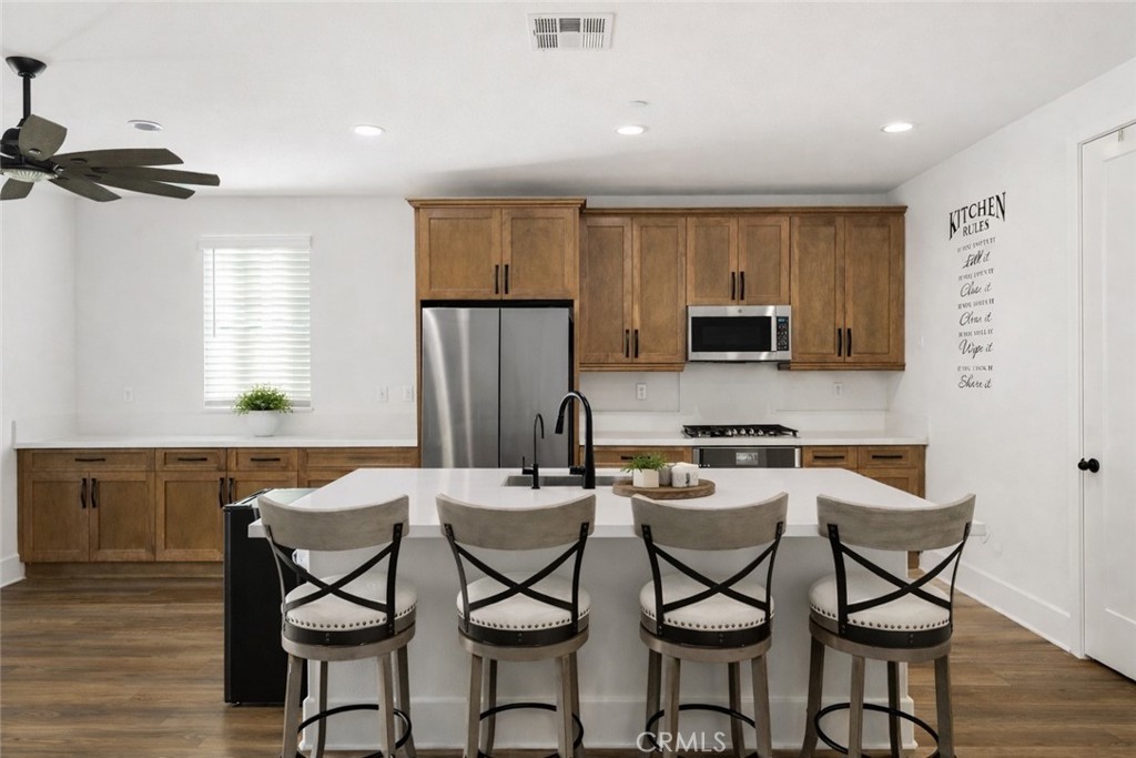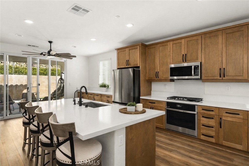Inside, the open-concept layout is designed for modern living, with upgraded flooring, a fireplace, built-in speakers, wired ethernet, and a spacious great room that connects seamlessly to the kitchen and dining areas. The kitchen is upgraded with quartz countertops, GE Profile stainless steel appliances, soft-close cabinetry, and a generous pantry.